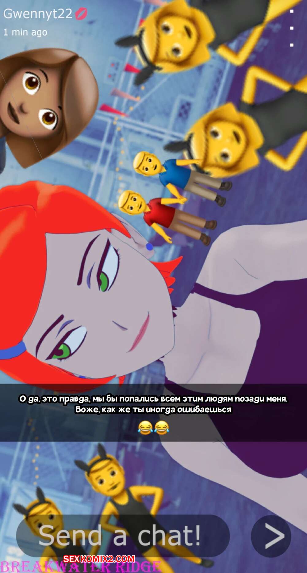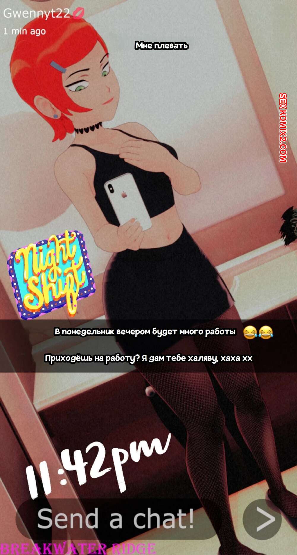 Порно комикс Бен 10. Гвен присылает тебе снимки. Часть 1. Gwen sends you snaps. Breakwater ridge Горячая рыжая красотка Гвен была возбуждена и решила повеселиться. Она написала своему дружку и стала ему отправлять свои сексуальные голые фото, получая от этого огромное удовольствие.