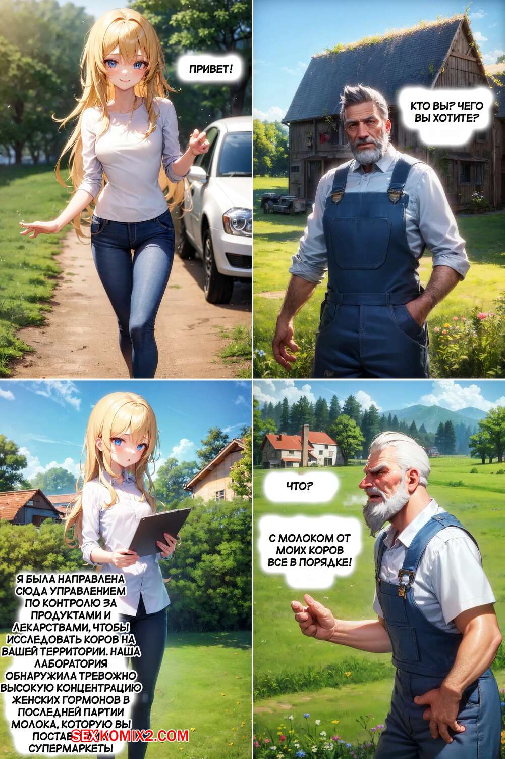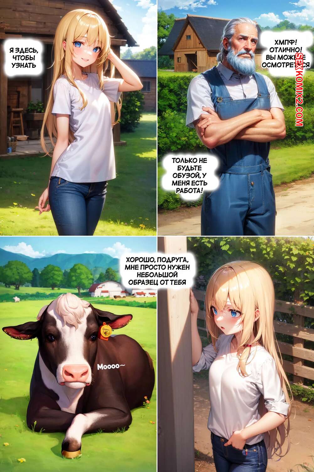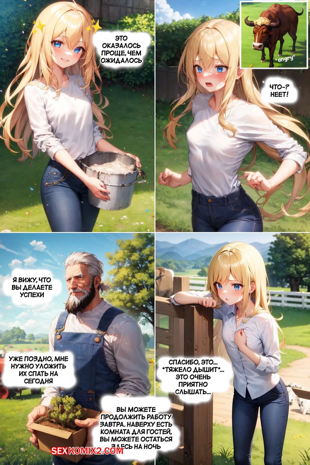 Порно комикс Бычий перебор. Bovine Bustout. AI Generated. Горячая блондинка приехала на ферму на летнюю подработку. Девушка обладает шикарным телом, но с ней творится чтото невероятное и ее прелести становятся только больше.