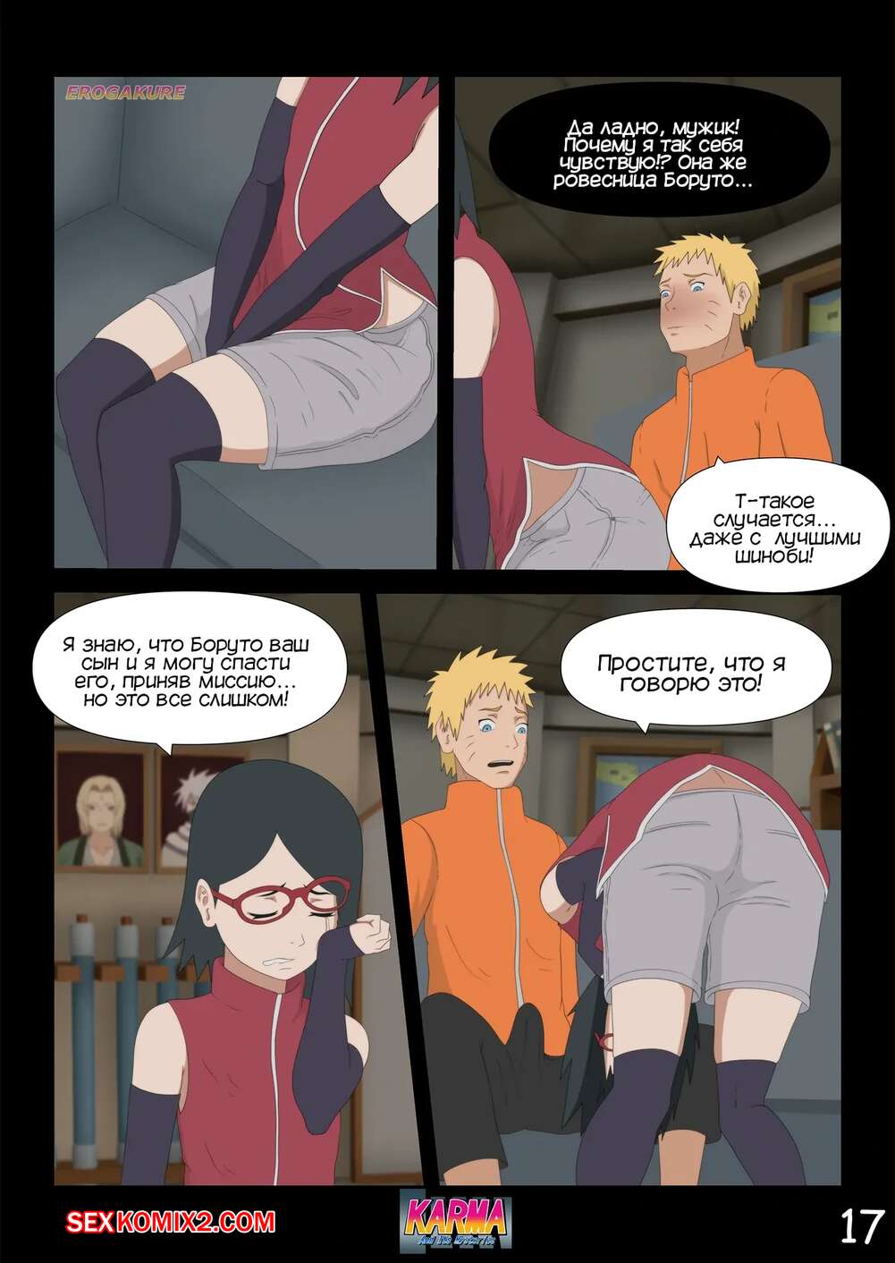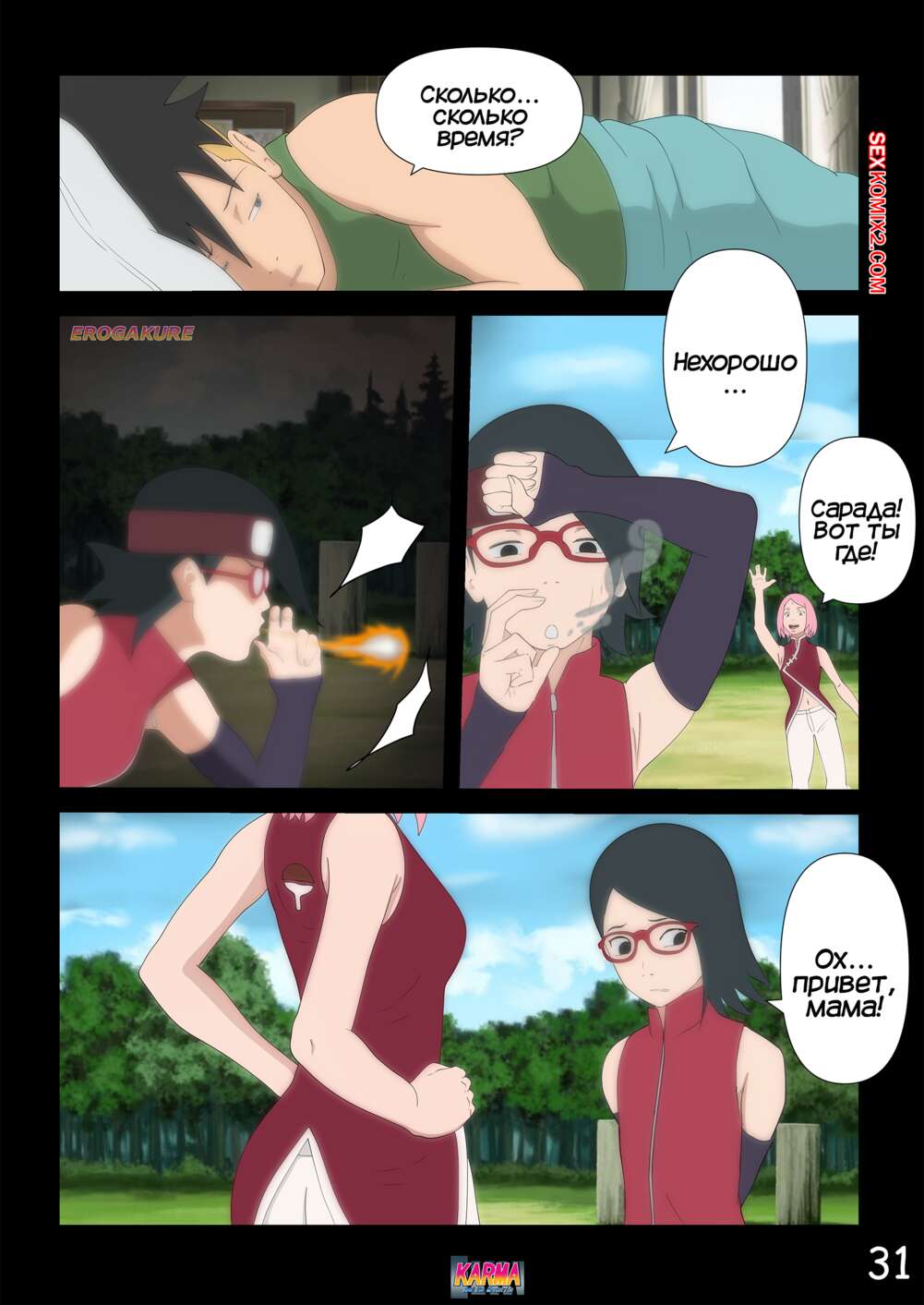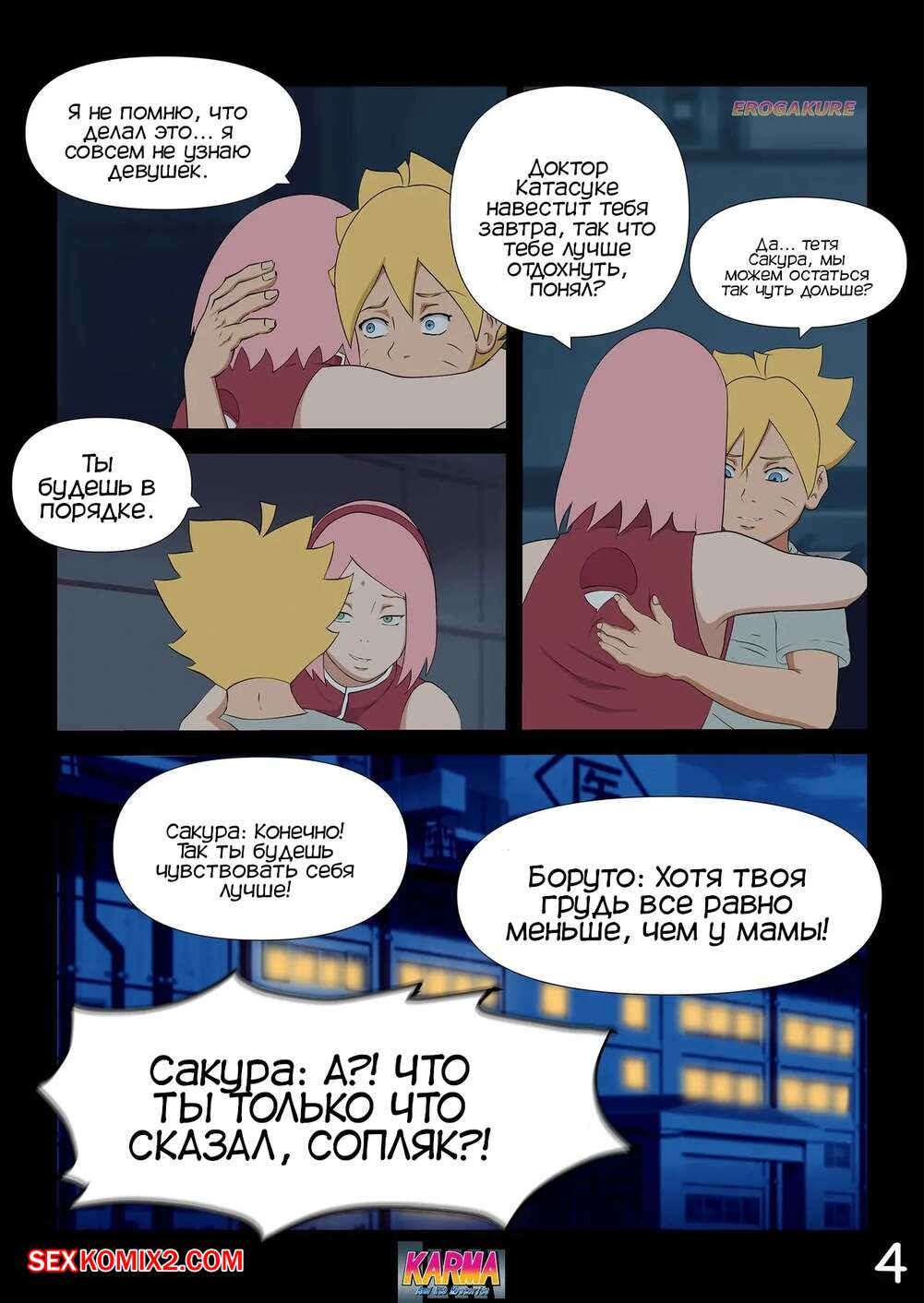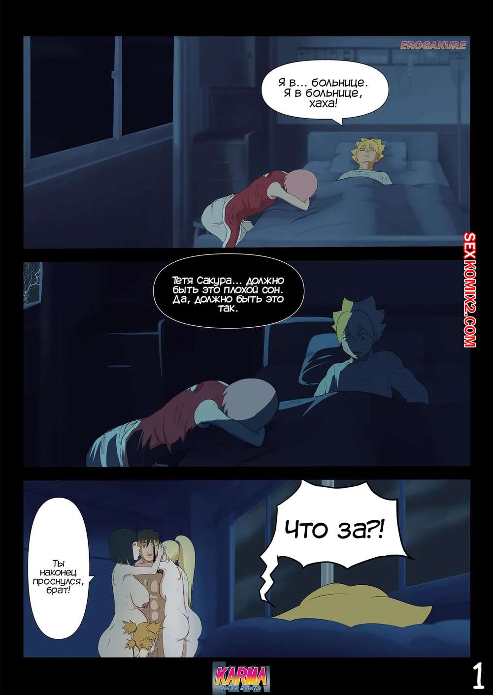 Порно комикс Боруто. Карма и ее тайны. Часть 3. Karma And Its Mysteries Боруто очнулся в больнице и ждет, что его навестит мама, но она никак к нему не идет. Красотка осталась дома одна с Каваки и дала ему выебать свою задницу, после чего сынок заполнил попку мамочки.