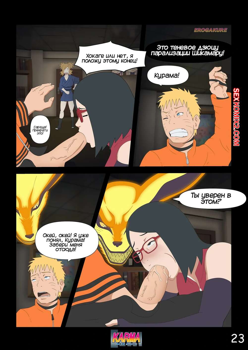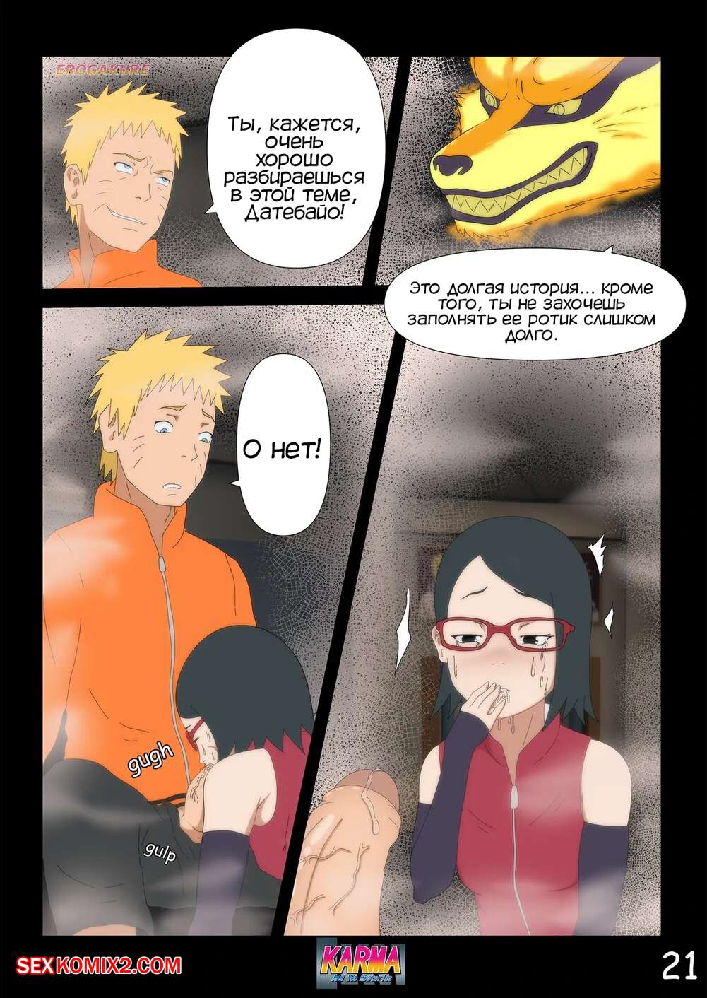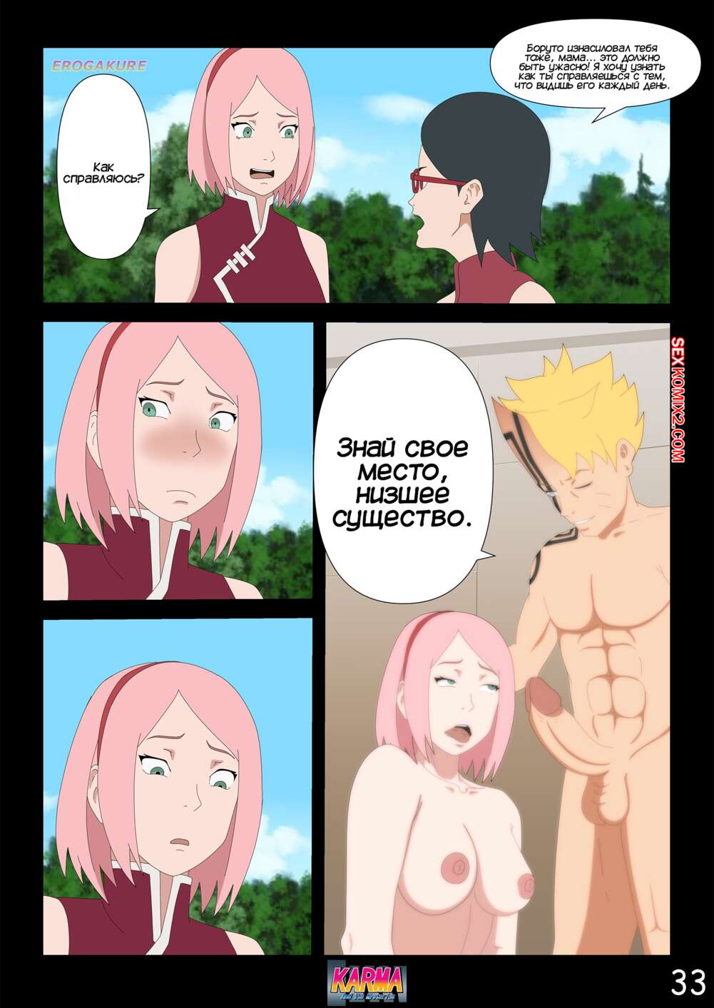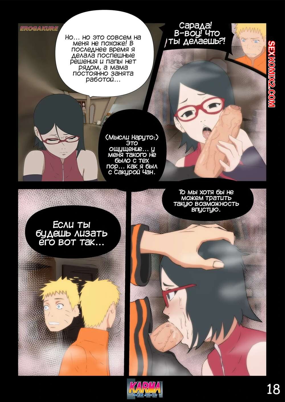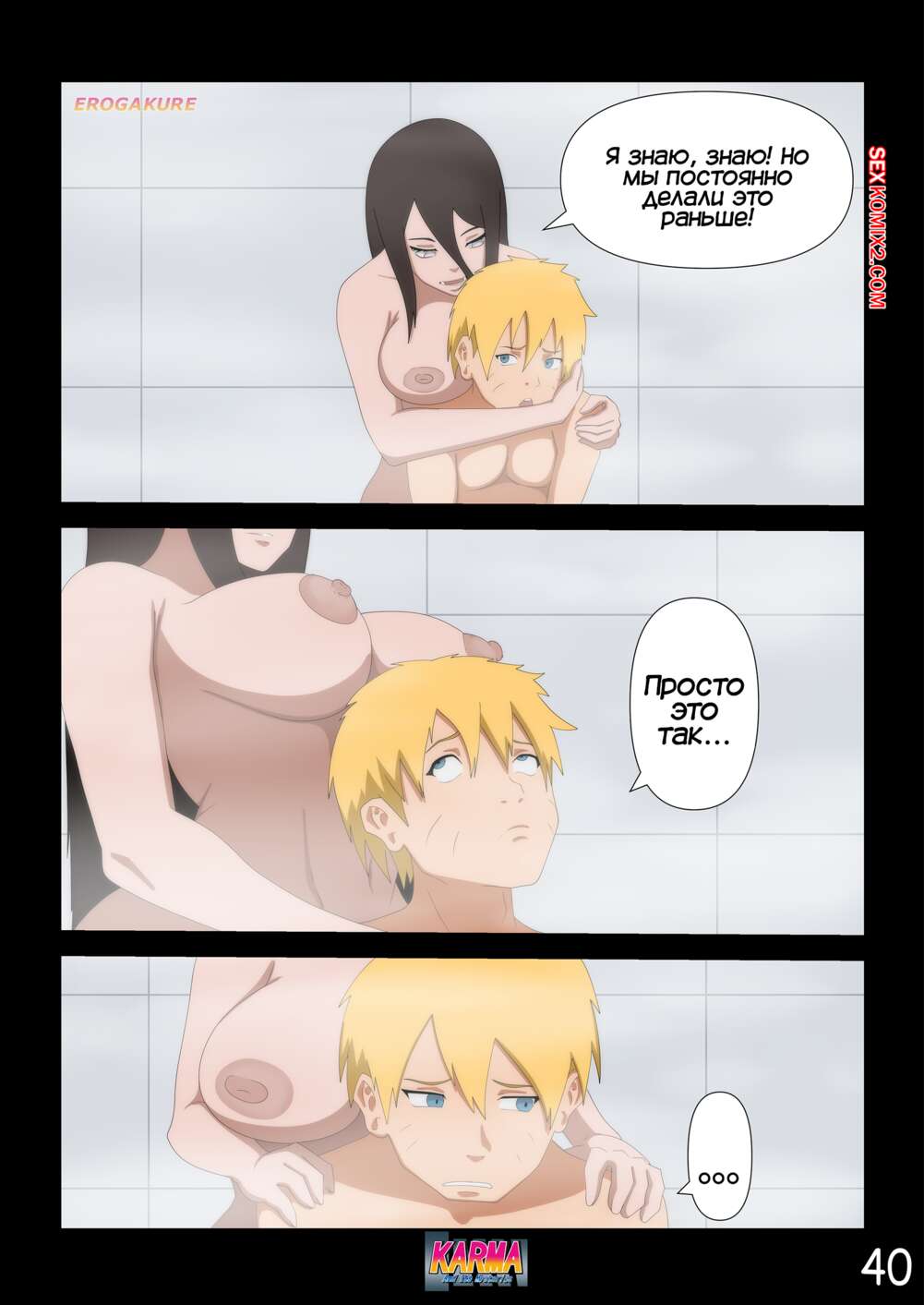 Порно комикс Боруто. Карма и ее тайны. Часть 3. Karma And Its Mysteries Боруто очнулся в больнице и ждет, что его навестит мама, но она никак к нему не идет. Красотка осталась дома одна с Каваки и дала ему выебать свою задницу, после чего сынок заполнил попку мамочки.