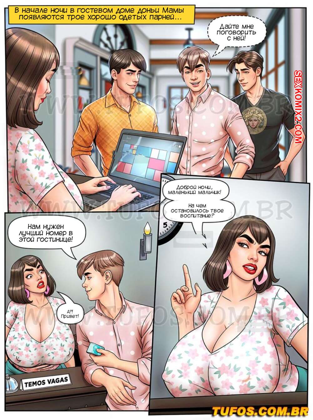 Порно комикс Донья Мама. Часть 4. Dona Mama a maezona da galera. Tufos В пансионат к Доне Маме пришли три богатых брата, и милфа решила устроить им VIPобслуживание. Она послелила их в комнату 69, куда вскоре пришла со своей дочерью, чтобы устроить БДСМ оргию.