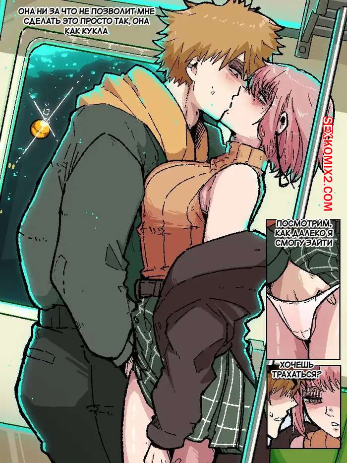Порно комикс Chainsaw Man. Общественный поезд. Public train. Mark Gavatino Парень с девушкой возбудились во время поездки в поезде и решили повеселиться. Они стали страстно целоваться и ласкать друг друга, после чего красотка оседлала большой хуй парня и дала ему себя выебать.