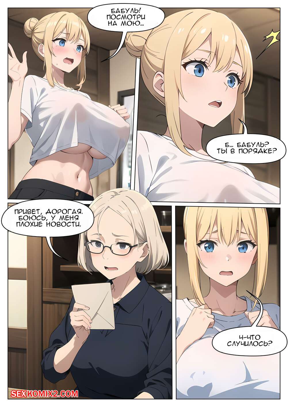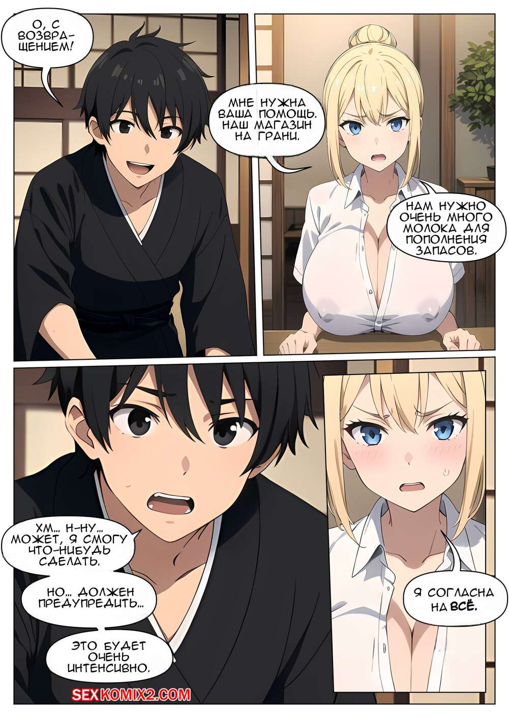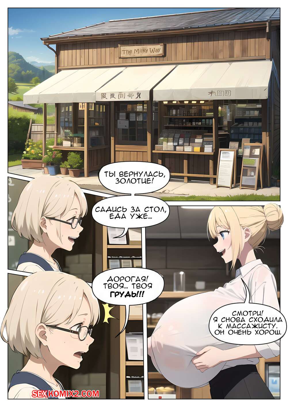 Порно комикс Млечный путь. Часть 3. The Milky Way. G U C Горячая блондинка проснулась после загадочной ночи и теперь ее сиськи невероятно большие. Это привлекло внимание ее дружка, который стал ласкать большие сиськи подруги, доставляя ей удовольствие.