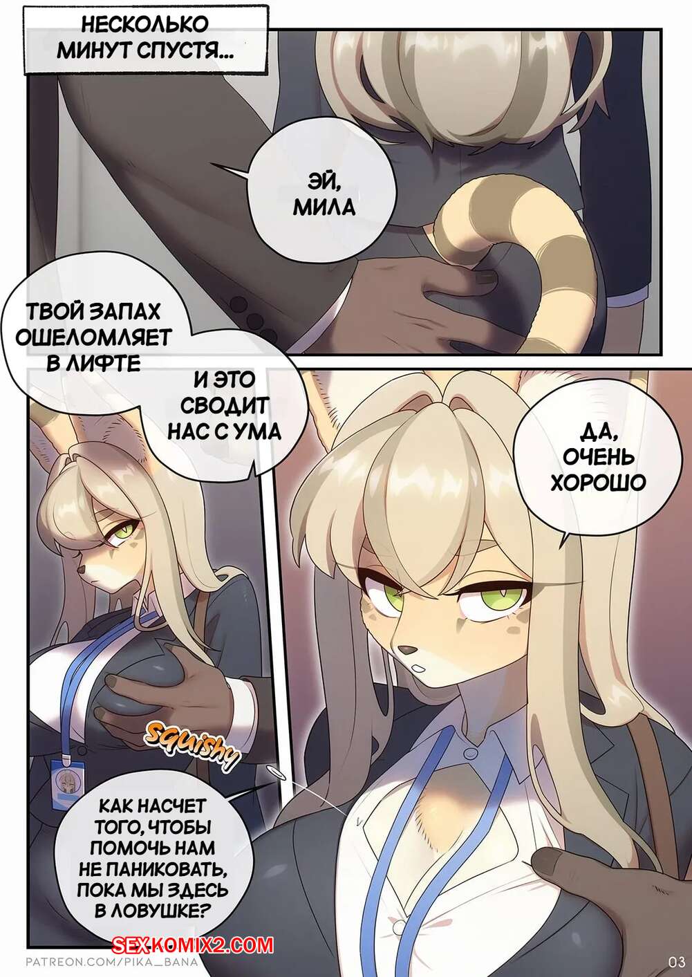 Порно комикс Работа СЕКСретаря. Часть 2. Strong Bana Горячая блондинка фурри ехала в лифте со своими коллегами. Лифт застрял, а парни решили воспользоваться моментом и выебали красотку во все дырочки, заполнив ее своей горячей спермой.